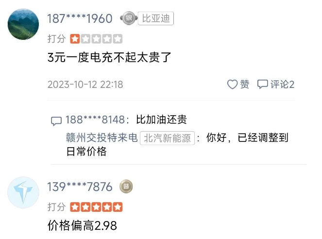 但是在評(píng)論區(qū)里,有多名不同手機(jī)號(hào)的用戶吐槽“電價(jià)過貴”的發(fā)言。2023年10月15日左右,先后有幾名網(wǎng)友責(zé)怪:“價(jià)格偏高2.98元”“3元一度電充不起太貴了”……當(dāng)時(shí),贛州交投特來電于去年10月13日回復(fù)道:已經(jīng)調(diào)整到日常價(jià)格。