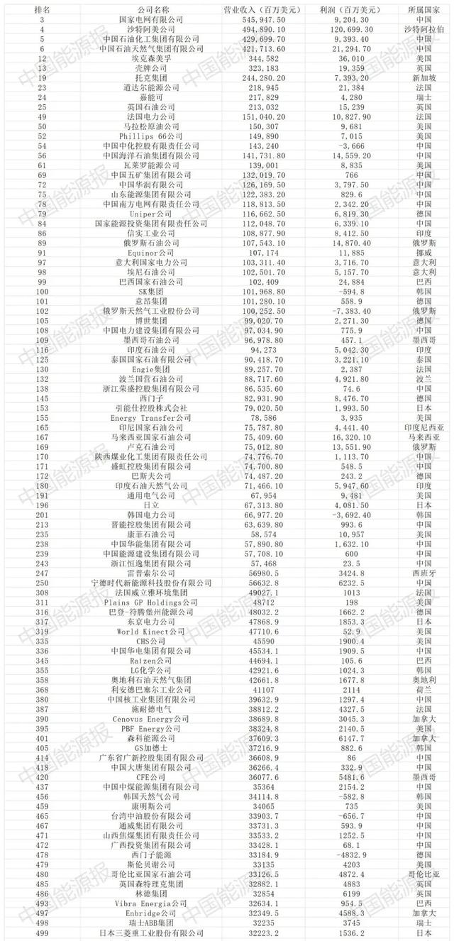 在排名前100的企業(yè)中,共有29家能源企業(yè),中國能源企業(yè)占據10家,比例超過1/3。
