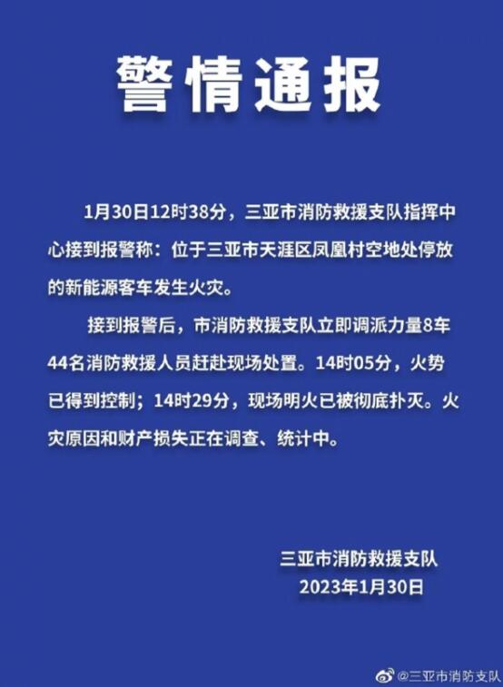 另?yè)?jù)三亞市消防支隊(duì)通報(bào)稱(chēng),30日12時(shí)38分,三亞市消防救援支隊(duì)指揮中心接到報(bào)警稱(chēng):位于三亞市天涯區(qū)鳳凰村空地處停放的新能源客車(chē)發(fā)生火災(zāi)。支隊(duì)調(diào)派8車(chē)44名消防救援人員趕赴現(xiàn)場(chǎng)處置。14時(shí)05分,火勢(shì)已得到控制;14時(shí)29分,現(xiàn)場(chǎng)明火已被徹底撲滅?;馂?zāi)原因和財(cái)產(chǎn)損失正在調(diào)查、統(tǒng)計(jì)中。