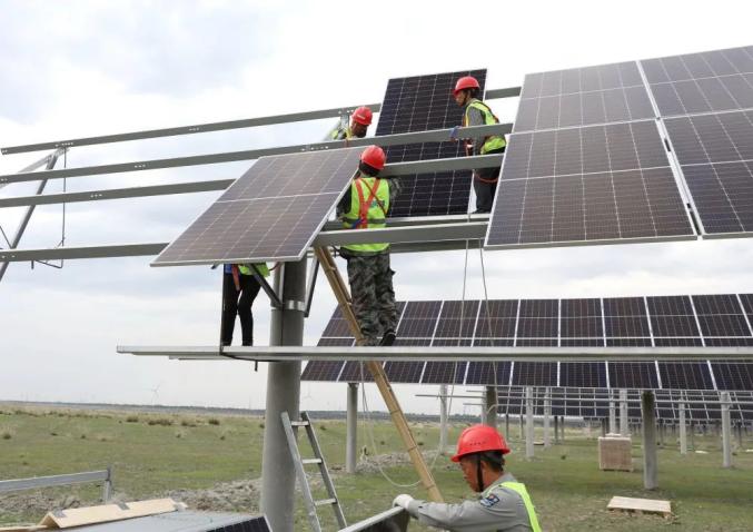 7月11日,在張家口市康保縣張紀(jì)鎮(zhèn),工人在一處光伏發(fā)電場建設(shè)工地施工。新華社記者 楊世堯 攝