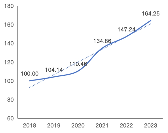 指數(shù)結(jié)果顯示,2023年,內(nèi)蒙古現(xiàn)代能源經(jīng)濟(jì)發(fā)展指數(shù)高速增長,達(dá)164.25點,同比增長11.55%,基期以來年均復(fù)合10.43%,發(fā)展質(zhì)速較前期進(jìn)一步提升。從分項指數(shù)看,低碳轉(zhuǎn)型、創(chuàng)新驅(qū)動、經(jīng)濟(jì)高效和社會貢獻(xiàn)四大維度發(fā)展均穩(wěn)中向好、好中有進(jìn)、進(jìn)中蓄勢,在錯綜復(fù)雜的國內(nèi)外形勢挑戰(zhàn)下彰顯了內(nèi)蒙古現(xiàn)代能源經(jīng)濟(jì)的活力與潛力。