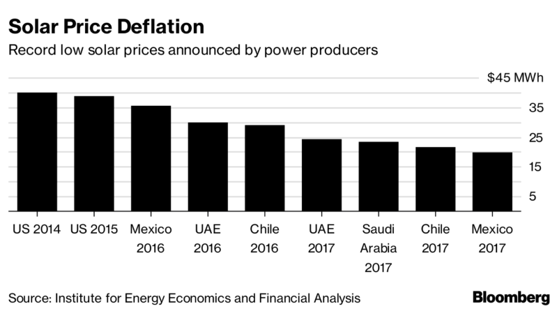 根據彭博新能源財經數(shù)據,IEEFA表示,2017年全球新增太陽能裝機98吉瓦,中國占53吉瓦。同時,發(fā)電資產使用期間的單位電力成本同比下降15%,至86美元/兆瓦時。
