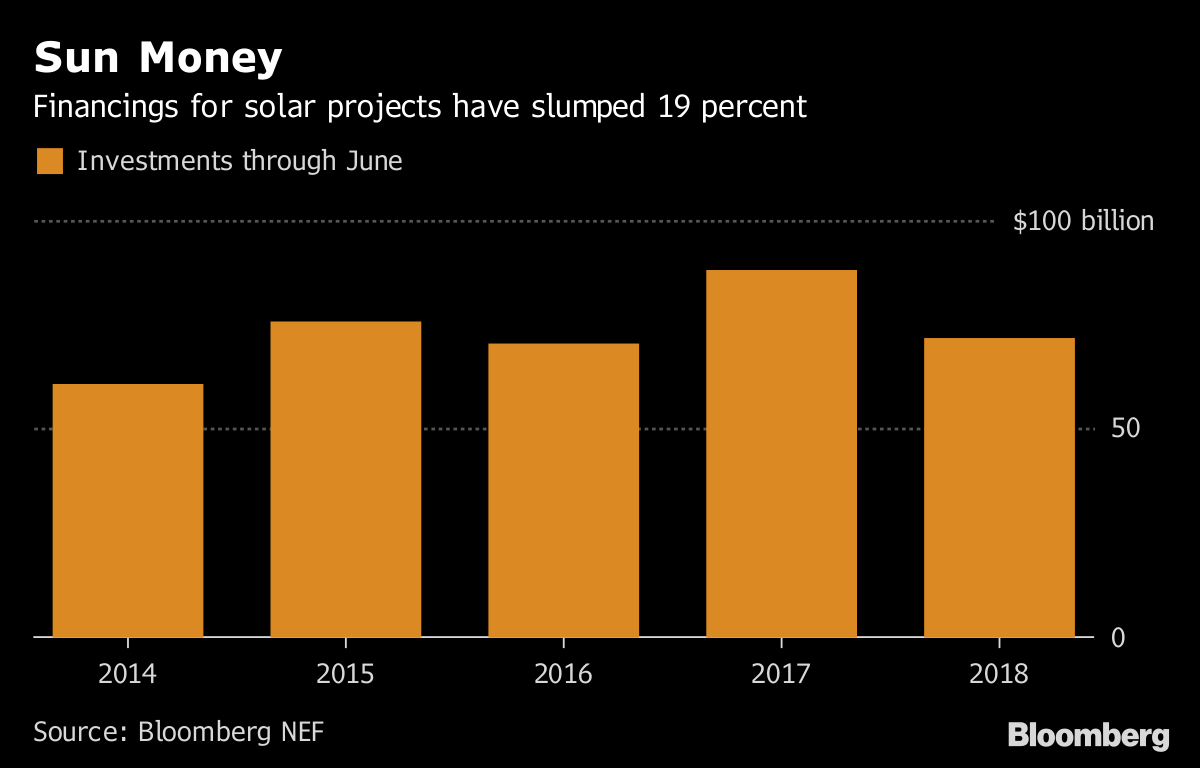 風(fēng)電投資在中國(guó)也有所增長(zhǎng),上半年增加到176億美元。太陽(yáng)能則完全是一個(gè)不同的狀態(tài),投資下降29%至351億美元。這部分是因?yàn)橹袊?guó)政府的“531光伏新政”計(jì)劃正在放慢太陽(yáng)能發(fā)展的步伐。