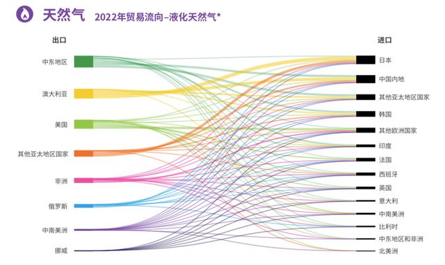 2022年,國際液化天然氣貿(mào)易量占所有地區(qū)間天然氣貿(mào)易量的56%,總量達(dá)到5,420億立方米,較上一年增長5%。中東地區(qū)是最大的液化天然氣出口地區(qū),與澳大利亞和美國合計(jì)占液化天然氣出口總量的65%。日本是最大的液化天然氣進(jìn)口國,進(jìn)口量達(dá)980億立方米,與中國合計(jì)占全球進(jìn)口總量的35%。亞太地區(qū)的進(jìn)口量約占液化天然氣進(jìn)口總量的65%,歐洲地區(qū)緊隨其后,占比超過30%。