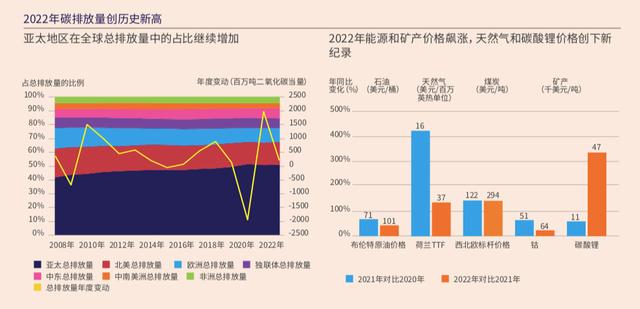 年鑒顯示,2022年,全球一次能源需求增長放緩,整體增速低于2021年;除歐洲與獨(dú)聯(lián)體外,所有地區(qū)的一次能源消費(fèi)量均有增長。其中,石油、煤炭、天然氣三種資源的價(jià)格持續(xù)走高。數(shù)據(jù)顯示,全球石油消費(fèi)量、煤炭需求和產(chǎn)量均有所增長;而天然氣需求下降3%,管道天然氣凈貿(mào)易的總量也同步下滑。同時(shí),可再生能源發(fā)電占比的提升也已成為重要趨勢——2022年,可再生電力(不包括水電)增長14%,滿足了84%的電力需求凈增量。