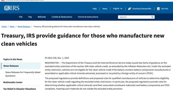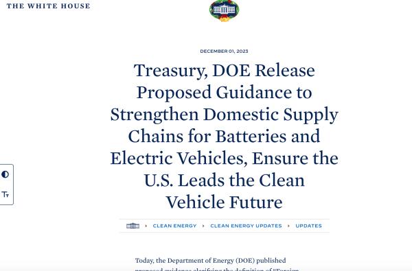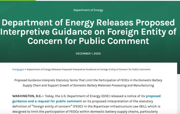 12月1日,美國(guó)能源部(DOE)發(fā)布《兩黨基礎(chǔ)設(shè)施法》中 “敏感外國(guó)實(shí)體(Foreign Entity of Concern,F(xiàn)EOC)”的解釋文件。同日,美國(guó)財(cái)政部(Treasury)和國(guó)稅局(IRS)發(fā)布了《通貨膨脹削減法》(IRA)第30D條清潔能源車輛稅收抵免相關(guān)禁令的指導(dǎo)意見(jiàn)。