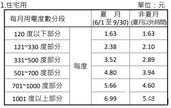 一般家庭由于用電量較少且低谷時(shí)段(22:30-07:30)用電量不多,故多采用階梯電價(jià)計(jì)費(fèi)。以夏月為例,假設(shè)每月用電433度,其中的120度每度電價(jià)為1.63元新臺(tái)幣(與非夏月單價(jià)一致),121度-330度部分對(duì)應(yīng)每度2.38元新臺(tái)幣,剩余103度對(duì)應(yīng)3.52元新臺(tái)幣,逐級(jí)增加。簡言之,用電量越大、單價(jià)越高。