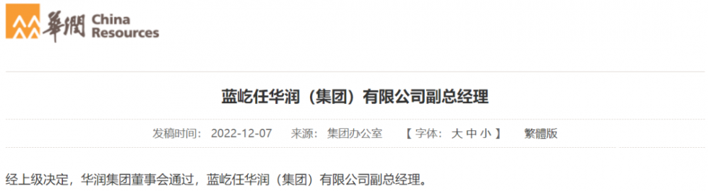 12月7日,經(jīng)上級(jí)決定,華潤(rùn)集團(tuán)董事會(huì)通過(guò),藍(lán)屹任華潤(rùn)(集團(tuán))有限公司副總經(jīng)理。