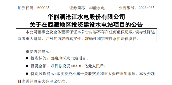 華能水電5月30日晚間公告,公司擬在西藏地區(qū)投資建設水電站項目,項目裝機容量260萬千瓦,多年平均發(fā)電量112.81億千瓦時,工程總工期132個月(不含籌建期),按2022年三季度價格水平計算,工程總投資583.81億元。