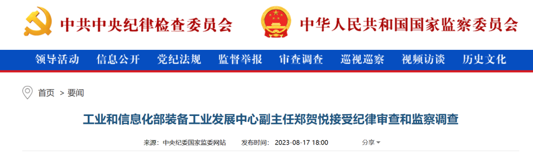 中央紀委國家監(jiān)委網(wǎng)站8月17日消息,據(jù)中央紀委國家監(jiān)委駐工業(yè)和信息化部紀檢監(jiān)察組、云南省紀委監(jiān)委消息:工業(yè)和信息化部裝備工業(yè)發(fā)展中心副主任鄭賀悅涉嫌嚴重違紀違法,目前正接受中央紀委國家監(jiān)委駐工業(yè)和信息化部紀檢監(jiān)察組紀律審查和云南省普洱市監(jiān)委監(jiān)察調查。