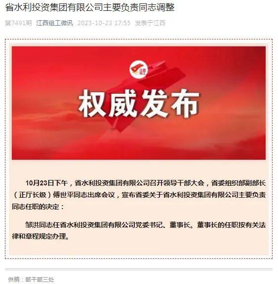 鄒洪同志任江西省水利投資集團(tuán)有限公司黨委書記、董事長。董事長的任職按有關(guān)法律和章程規(guī)定辦理。