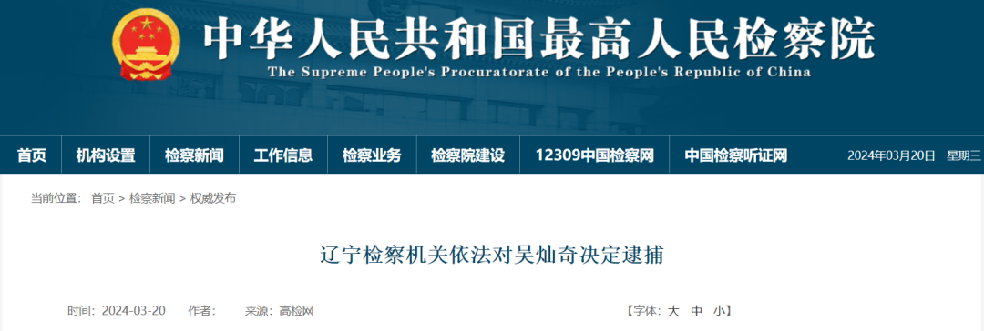 經(jīng)遼寧省人民檢察院指定管轄,由朝陽市人民檢察院審查起訴。日前,朝陽市人民檢察院依法以涉嫌受賄罪對吳燦奇作出逮捕決定。該案正在進一步辦理中。