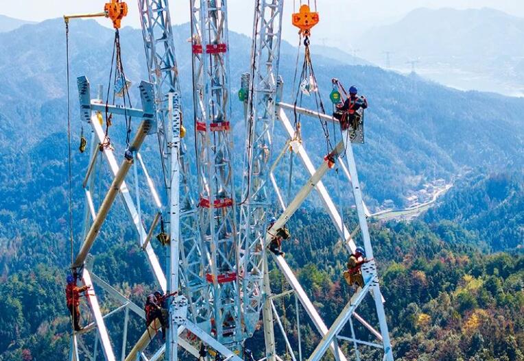 圖為2024年3月12日,電力工人在湖南省益陽市安化縣冷市鎮(zhèn)進行組塔作業(yè)。 新華社記者 陳思汗/攝
