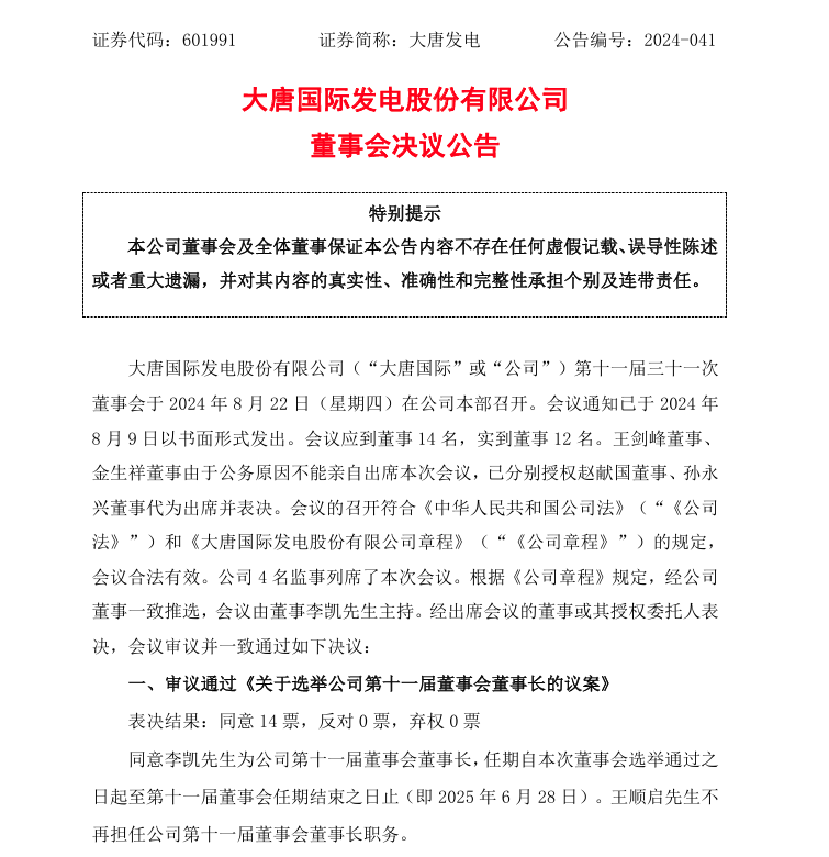 8月23日,大唐發(fā)電公告稱,董事會(huì)審議通過(guò)《關(guān)于選舉公司第十一屆董事會(huì)董事長(zhǎng)的議案》,同意李凱先生為公司第十一屆董事會(huì)董事長(zhǎng),任期自本次董事會(huì)選舉通過(guò)之 日起至第十一屆董事會(huì)任期結(jié)束之日止(即2025年6月28日)。王順啟先生不再擔(dān)任公司第十一屆董事會(huì)董事長(zhǎng)職務(wù)。