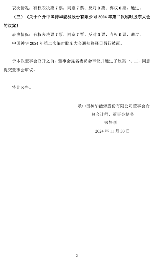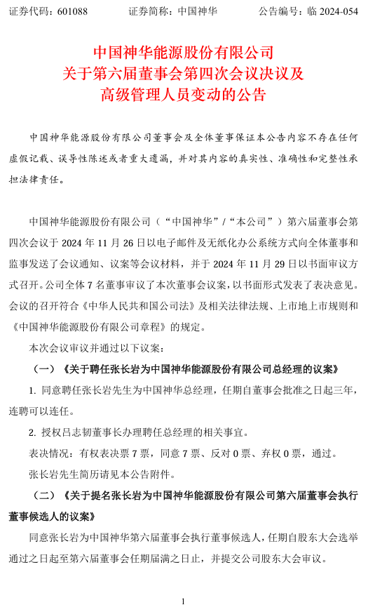 中國(guó)神華11月30日發(fā)布公告,公司第六屆董事會(huì)第四次會(huì)議于2024年11月26日以電子郵件及無(wú)紙化辦公系統(tǒng)方式向全體董事和監(jiān)事發(fā)送了會(huì)議通知、議案等會(huì)議材料,并于2024年11月29日以書面審議方式召開。公司全體7名董事審議了本次董事會(huì)議案,以書面形式發(fā)表了表決意見(jiàn)。