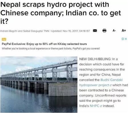尼泊爾原計(jì)劃推進(jìn)與中國合作建設(shè)價(jià)值25億美元的水電站。但是有消息指出,該國已放棄這一計(jì)劃,并且表示此舉不針對(duì)任何機(jī)構(gòu)或個(gè)人、不涉政治。