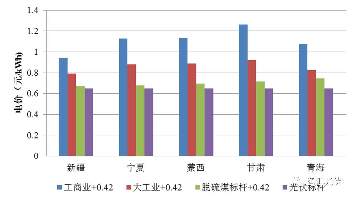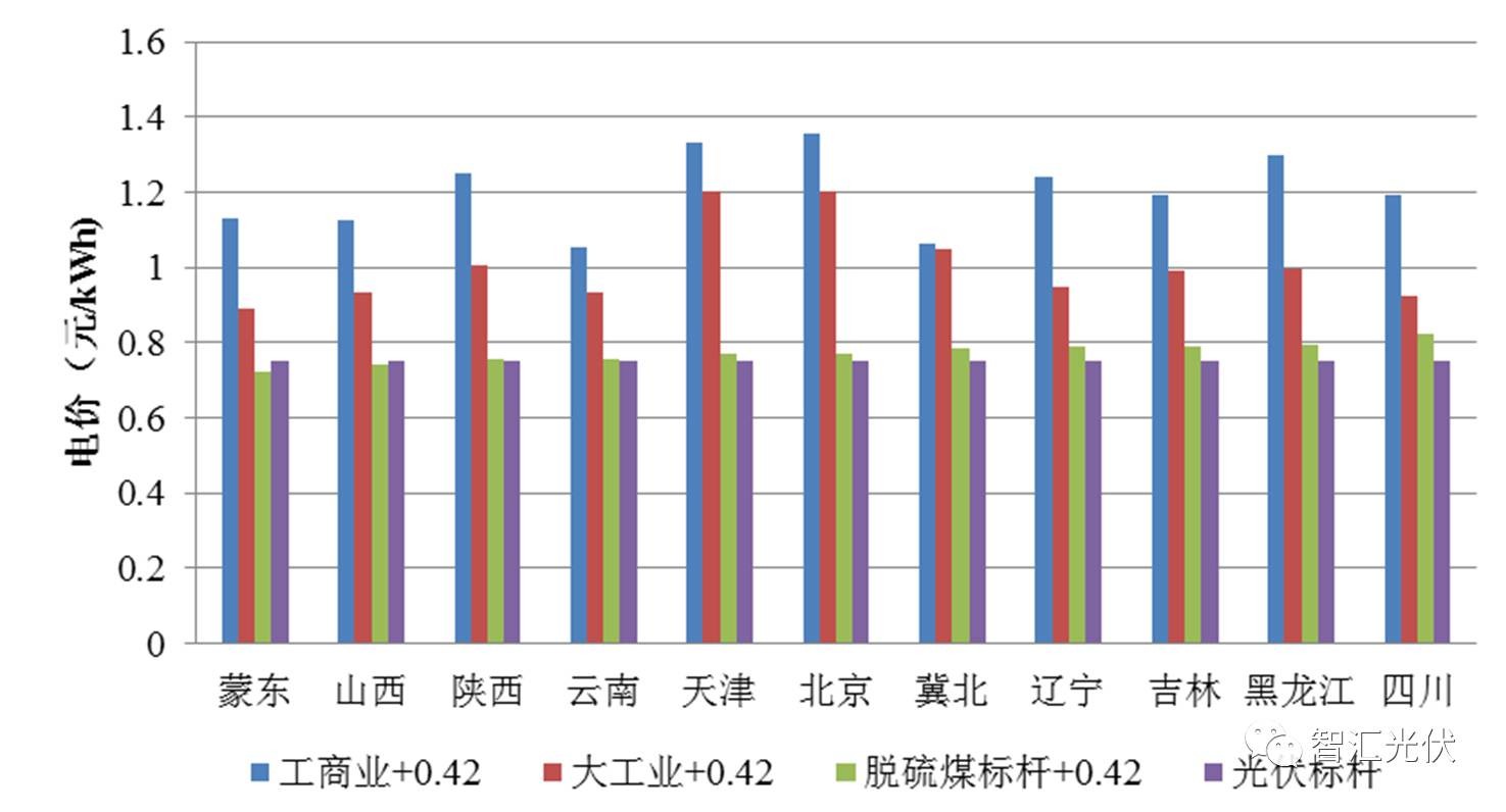 可以看出: “工商業(yè)+0.42”比0.65元/kWh高0.29~0.61元/kWh “大工業(yè)+0.42”比0.65元/kWh高0.14~0.27元/kWh 脫硫煤+0.42”比0.65元/kWh高0.02~0.095元/kWh 即在Ⅰ 類資源區(qū),無論是在工商業(yè)屋頂,還是大工業(yè)屋頂,“自發(fā)自用電價”、“余電上網電價“均高于當地的“全額上網”標桿電價0.65元/kWh。