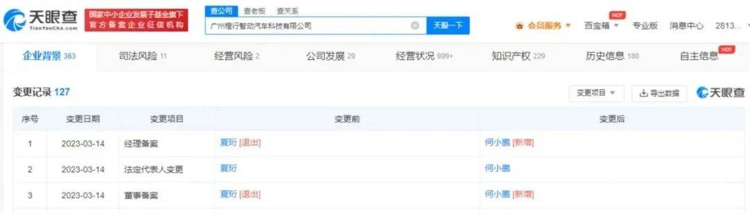 根據(jù)天眼查App顯示,近日,廣州橙行智動汽車科技有限公司發(fā)生工商變更,夏珩卸任法定代表人、執(zhí)行董事、經(jīng)理,由何小鵬接任。不久前,夏珩已接連卸任廣東小鵬汽車科技有限公司、廣州小鵬汽車科技有限公司職務(wù),并均由何小鵬接任。