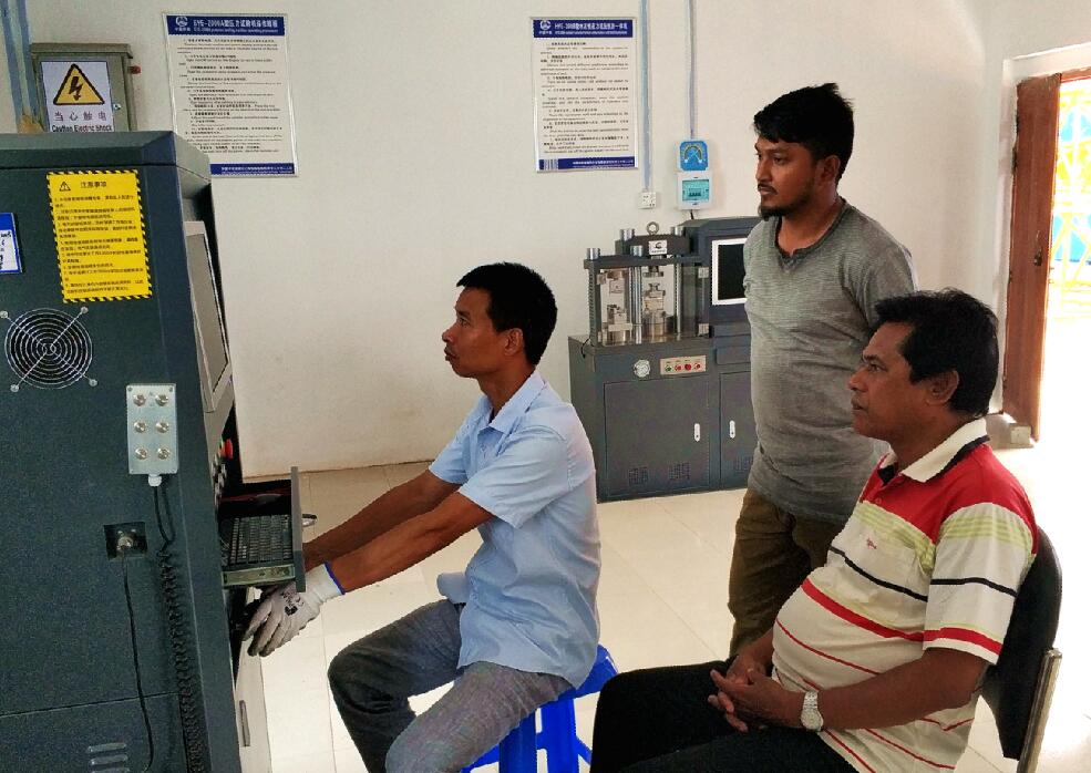 項目試驗室建設(shè)引進了國內(nèi)項目比較常用的萬能試驗機、壓力試驗機、水泥抗壓抗折一體機、電動擊實儀、EV2試驗儀、洛氏硬度計、扭矩試驗儀、螺栓抗滑試驗儀等40臺套主要試驗儀器,多數(shù)是由電腦控制,屬于先進設(shè)備。此后,項目試驗室主任陳立根成了大家的“中國師傅”,帶領(lǐng)16名孟籍試驗員一起學(xué)習研究業(yè)主招標文件和技術(shù)規(guī)格書,手把手教授使用各種試驗儀器設(shè)備,帶領(lǐng)大家一起開展路基填料、混凝土配比試拌、鋼筋試驗等。“他毫無保留地把自己掌握的試驗操作規(guī)程都教給了我們。”然森很慶幸自己擁有這樣一位“中國師傅”。