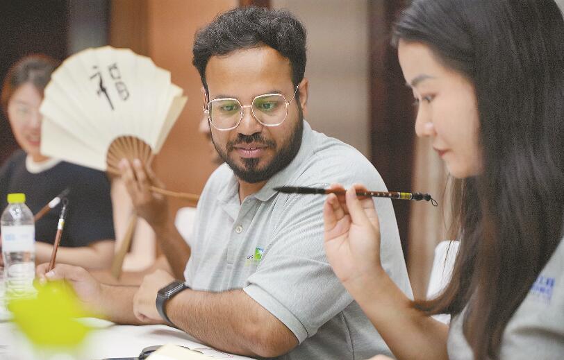 “學(xué)漢字,畫扇面”活動(dòng)也得到留學(xué)生們的好評(píng)。專業(yè)書法老師介紹了漢字的起源和發(fā)展,指導(dǎo)他們從基本的運(yùn)筆學(xué)起,最終將“福”字這一學(xué)習(xí)成果展現(xiàn)在各自的扇面上。大家熱情高漲,甚至自主延伸,將中文和阿語結(jié)合。