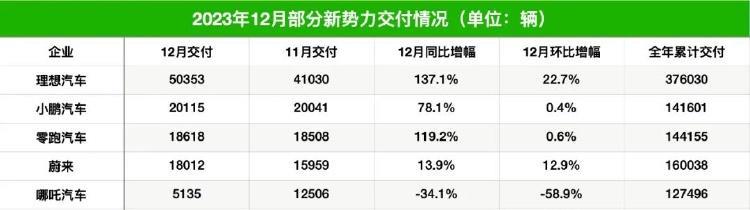 哪吒汽車(chē)在2023年12月僅交付5135輛新車(chē),同比下滑34.1%,是當(dāng)月唯一銷(xiāo)量同比下滑的造車(chē)新勢(shì)力。2023年全年,哪吒汽車(chē)共交付新車(chē)約12.7萬(wàn)輛,未能完成此前制定的25萬(wàn)輛的年度銷(xiāo)售目標(biāo)。