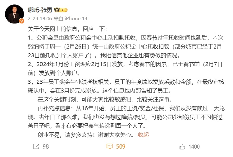 澎湃新聞注意到,春節(jié)復(fù)工后,多位員工在脈脈平臺(tái)爆料稱,此前哪吒汽車的CEO張勇承諾年后上班第一周發(fā)放年終獎(jiǎng)卻并未兌現(xiàn),人事部門經(jīng)理在群內(nèi)通知稱,年終獎(jiǎng)延遲到3月發(fā)放。該事經(jīng)發(fā)酵后,張勇在個(gè)人微博進(jìn)行了回應(yīng)。