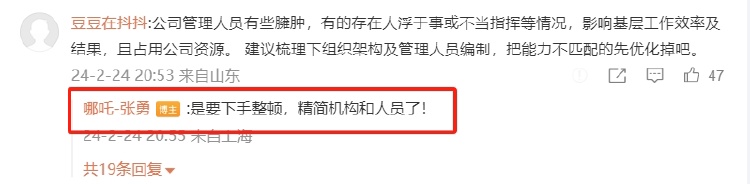 值得一提的是,在該條微博評(píng)論區(qū),張勇對(duì)有網(wǎng)友建議“梳理組織架構(gòu)及管理人員編制,把能力不匹配的先優(yōu)化掉”的評(píng)論進(jìn)行了回復(fù),其表示,“是要下手整頓,精簡(jiǎn)機(jī)構(gòu)和人員了。”