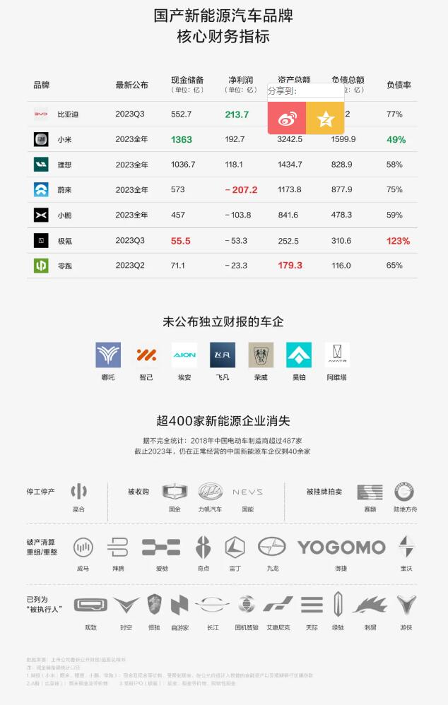 就是過去五年來,內(nèi)卷加速“品牌淘汰”,大批造車企業(yè)消亡。據(jù)不完全統(tǒng)計(jì)僅在2018年-2023年五年間,銷聲匿跡的國(guó)產(chǎn)新能源品牌就超過400家,新能源這場(chǎng)大逃殺的淘汰了高達(dá)90%。而細(xì)細(xì)分析,這400多家品牌或多或少有著一些共性:小品牌、高負(fù)債、靠資本輸血、資金實(shí)力差。