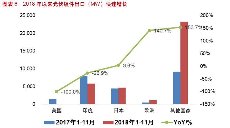 中國光伏行業(yè)協(xié)會(huì)的數(shù)據(jù)顯示,2018年光伏產(chǎn)品(硅片、電池片、組件)出口總額達(dá)161.1億美元,創(chuàng)下歐美“雙反”后最高水平,同比增長10.9%。組件市場(chǎng)方面,光伏市場(chǎng)出口集中度繼續(xù)下降,形成傳統(tǒng)市場(chǎng)和新興市場(chǎng)(南美、中東北非)結(jié)合的多元化市場(chǎng)傳統(tǒng)市場(chǎng)方面,因歐盟取消了長達(dá)五年的“雙反”政策,歐洲市場(chǎng)復(fù)蘇,對(duì)荷蘭、德國、英國等歐洲主要國家的組件出口同比增長,對(duì)烏克蘭、西班牙的組件出口大幅增長。中國光伏行業(yè)協(xié)會(huì)預(yù)測(cè),歐盟市場(chǎng)2019年增速明顯增高,可達(dá)11GW,西班牙等啟動(dòng)平價(jià)上網(wǎng)項(xiàng)目,法國、荷蘭、意大利等也將有較大幅度增長。