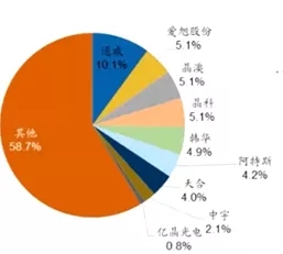 但是晶硅分為單晶硅和多晶硅,這兩者最大的區(qū)別是在于硅的純度和雜質(zhì)摻雜度。單晶硅具有較高的純度和較少的雜質(zhì),而多晶硅的純度較小且雜質(zhì)較多,所以單晶硅較多晶硅而言,單晶硅具有良好的導(dǎo)電性,同時也是主流的電池片。目前我國單晶硅市場份額占64.5%。這就說明在原材料的供應(yīng)上不存在瓶頸。