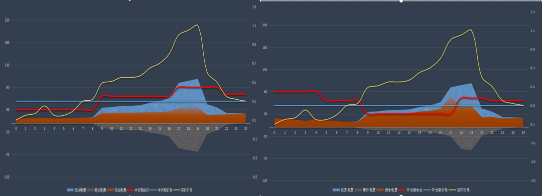 當(dāng)市場來臨的時候,部分國有發(fā)電企業(yè)的經(jīng)營模式并沒有調(diào)整到位,可能存在經(jīng)營決策失誤的原因。例如,中長期簽約時未充分考慮自身節(jié)點和用戶側(cè)現(xiàn)貨價格的差異,不同發(fā)電企業(yè)、不同用戶一個策略,簡單粗暴,不管簽?zāi)牡挠脩舳际且粋€價,只重視合同價格的高低,不考慮價差電費的高低,有些甚至不在合同中約定分時價格。如圖4所示,左圖與右圖用戶電量相同,左圖用戶合同價為0.4元/度,右圖用戶合同價為0.3元/度,兩個用戶用電曲線形狀不同,其他均相同。從大烏海區(qū)域部分電源的選擇來看,顯然更喜歡左圖用戶,然而事實卻告訴我們:由于右圖用戶價差電費要遠(yuǎn)高于左圖用戶的價差電費,最終的結(jié)算結(jié)果是合同價低25%的右圖用戶可以為電源帶來的電費(紅色部分)高于左圖用戶。