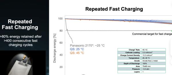 與此同時(shí),測(cè)試數(shù)據(jù)還顯示,配備 QuantumScape電池的電動(dòng)汽車,WLTP 續(xù)航里程為 500-600公里(311—373 英里),在電池的全生命周期內(nèi),可以行駛超過(guò)50萬(wàn)公里(約311,000 英里),不會(huì)有任何續(xù)航能力衰退。