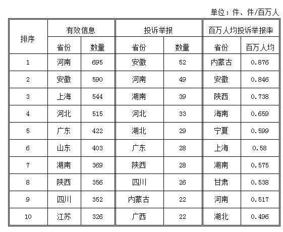 2018年1月,各?。ㄗ灾螀^(qū)、直轄市)按照有效信息數(shù)量排序,河南、安徽、上海等?。ㄊ校┝腥珖?0位;按照投訴舉報數(shù)量排序,安徽、河南、湖南等省排在全國前10位;按照百萬人均投訴舉報率排序,內蒙古、安徽、陜西等省(自治區(qū))位于全國前10位。(2018年1月有效信息及投訴舉報排名前10位情況見表三)