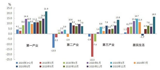 2020年,第一、二、三產(chǎn)業(yè)和居民生活用電量增速分別為10.7%、1.9%、1.4%、6.2%。其中,第一產(chǎn)業(yè)和居民生活用電量增速較上年分別上升5.0、1.5個(gè)百分點(diǎn),第二、第三產(chǎn)業(yè)用電增速較上年分別下降0.5、7.5個(gè)百分點(diǎn)。第二產(chǎn)業(yè)用電量基本恢復(fù)常態(tài)化增長(zhǎng),第三產(chǎn)業(yè)用電量增長(zhǎng)態(tài)勢(shì)較正常水平仍有較大差距。12月份,第一、二、三產(chǎn)業(yè)和居民生活用電量增速分別為21.9%、7.5%、13.6%、16.5%,第二產(chǎn)業(yè)用電量增速持續(xù)維持高位;第三產(chǎn)業(yè)用電量年內(nèi)首現(xiàn)兩位數(shù)增長(zhǎng),恢復(fù)態(tài)勢(shì)強(qiáng)勁;居民生活用電量受低溫寒潮天氣影響,增速創(chuàng)年內(nèi)新高。