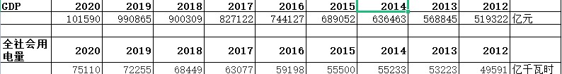 GDP、全社會用電量2012-2020年(GDP單位:億元,人民幣,全社會用電量:億千瓦時)