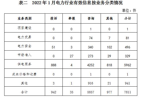 電力行業(yè)排在首位,有效信息數(shù)量為7811件,占全部有效信息的64.71%。群眾關(guān)注的內(nèi)容主要集中在故障停電、供電安全、電費計量和收繳等方面。(2022年1月電力行業(yè)有效信息按業(yè)務(wù)分類情況見表二)