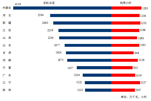 圖3 1-6月份風(fēng)電裝機(jī)較多省份風(fēng)電裝機(jī)容量和設(shè)備利用小時