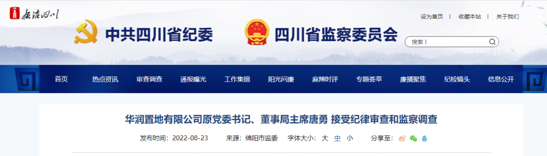 華潤置地有限公司原黨委書記、董事局主席、首席執(zhí)行官唐勇涉嫌嚴重違紀違法,目前華潤集團紀委正對其進行紀律審查,經(jīng)國家監(jiān)委指定四川省監(jiān)委管轄,四川省監(jiān)委指定綿陽市監(jiān)委管轄,綿陽市監(jiān)委正對其進行監(jiān)察調(diào)查。