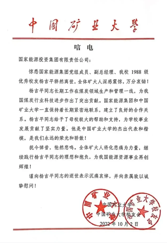國家能源集團黨組成員、副總經(jīng)理楊吉平同志,因突發(fā)疾病搶救無效,于2022年10月2日9時33分在北京不幸逝世,享年53歲。他的遺體送別會,于10月4日上午11:30在北京八寶山殯儀館舉行。