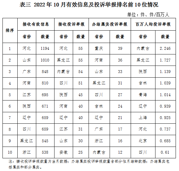 各省(自治區(qū)、直轄市)按照接收的有效信息數(shù)量排序,河北、山東、廣東、河南、江蘇、陜西、遼寧、四川、黑龍江、浙江排在全國前10位;按照接收的投訴舉報數(shù)量排序,河北、黑龍江、內(nèi)蒙古、四川、陜西、河南、遼寧、江蘇、山東、安徽排在全國前10位;按照辦結(jié)屬實的投訴舉報數(shù)量排序,重慶、河南、山東、黑龍江、四川、吉林、遼寧、廣東、浙江、內(nèi)蒙古排在全國前10位;按照百萬人均投訴舉報數(shù)量排序,內(nèi)蒙古、黑龍江、陜西、吉林、青海、遼寧、上海、河北、北京、四川排在全國前10位。(2022年10月有效信息及投訴舉報排名前10位情況見表三)