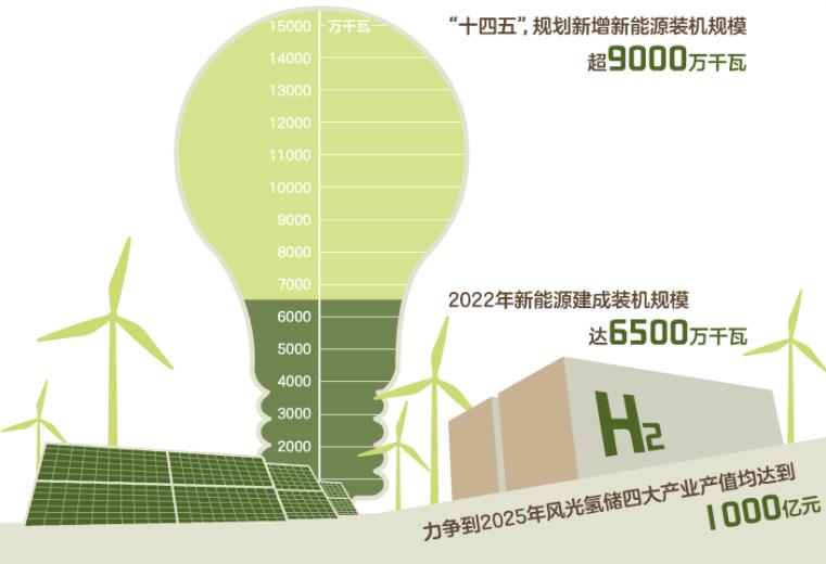 2022年,內蒙古新能源建成裝機規(guī)模達到6500萬千瓦,連續(xù)兩年成為全國唯一一個風電光伏發(fā)電量超過1000億千瓦時的省區(qū)。“十四五”期間,內蒙古規(guī)劃新增超過9000萬千瓦的新能源裝機規(guī)模,力爭到2025年風光氫儲四大產業(yè)產值均達到1000億元。