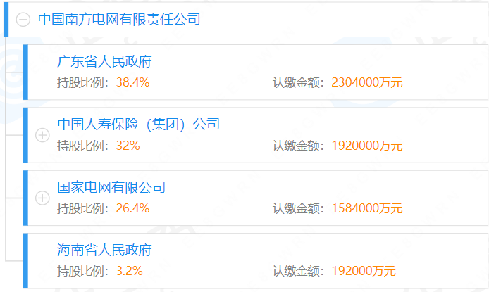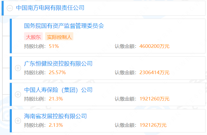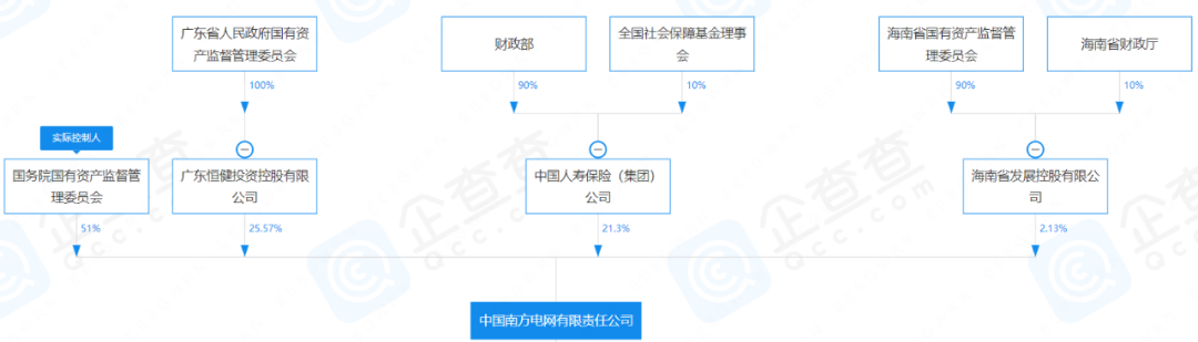 據媒體2021年12月報道,完善南方電網股權結構推動高質量發(fā)展專題會議在深圳召開,南方電網股權結構調整為國務院國資委持股51%、廣東省人民政府持股25.57%、中國人壽保險(集團)公司持股21.3%、海南省人民政府持股2.13%。