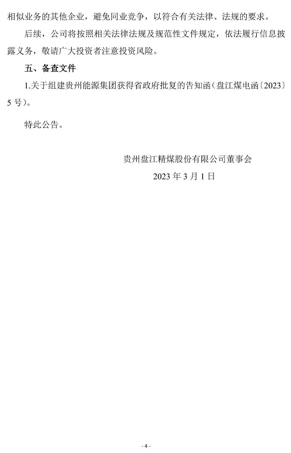 3月1日,盤江股份發(fā)布《關于控股股東更名的公告》(以下簡稱《公告》)。貴州省擬組建貴州能源集團有限公司(以下簡稱“貴州能源集團”),將盤江煤電集團更名為貴州能源集團。吸收合并貴州烏江能源集團有限責任公司(以下簡稱“烏江能源集團”)后,注銷烏江能源集團。