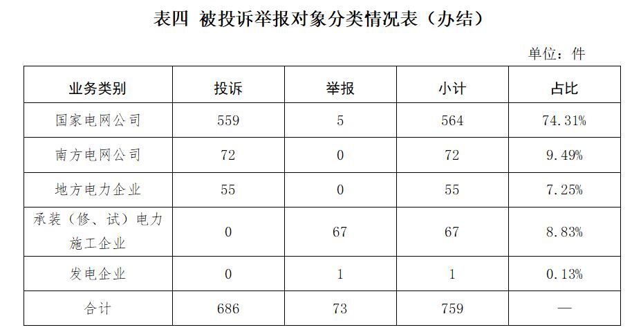 從被投訴舉報(bào)對象看,供電企業(yè)691件、占比91.04%,其中國家電網(wǎng)公司564件、占比74.31%,南方電網(wǎng)公司72件、占比9.49%,地方電力企業(yè)55件、占比7.25%;承裝(修、試)電力施工企業(yè)投訴舉報(bào)67件、占比8.83%;新能源企業(yè)投訴舉報(bào)1件、占比0.13%。(詳見表四)