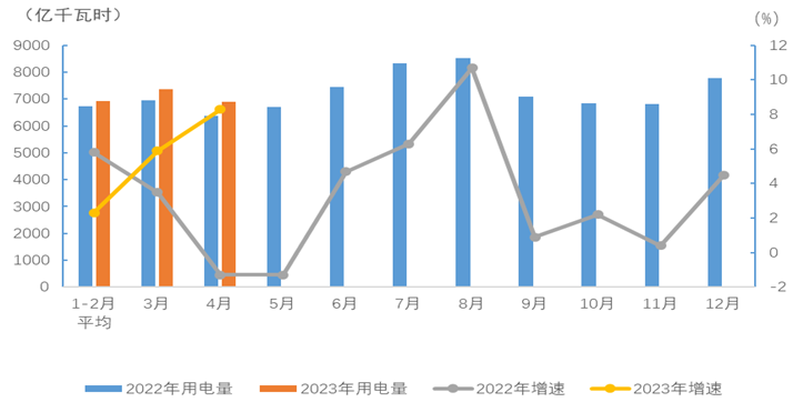 圖1 2022、2023年分月全社會用電量及其增速