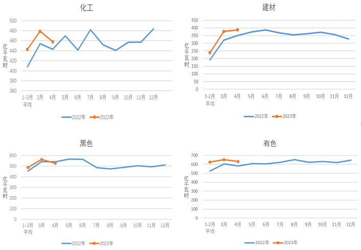 1-4月,化工行業(yè)用電量1823億千瓦時,同比增長3.0%;建材行業(yè)用電量1245億千瓦時,同比增長8.6%;黑色金屬冶煉行業(yè)用電量2061億千瓦時,同比增長1.5%;有色金屬冶煉行業(yè)用電量2533億千瓦時,同比增長4.9%。