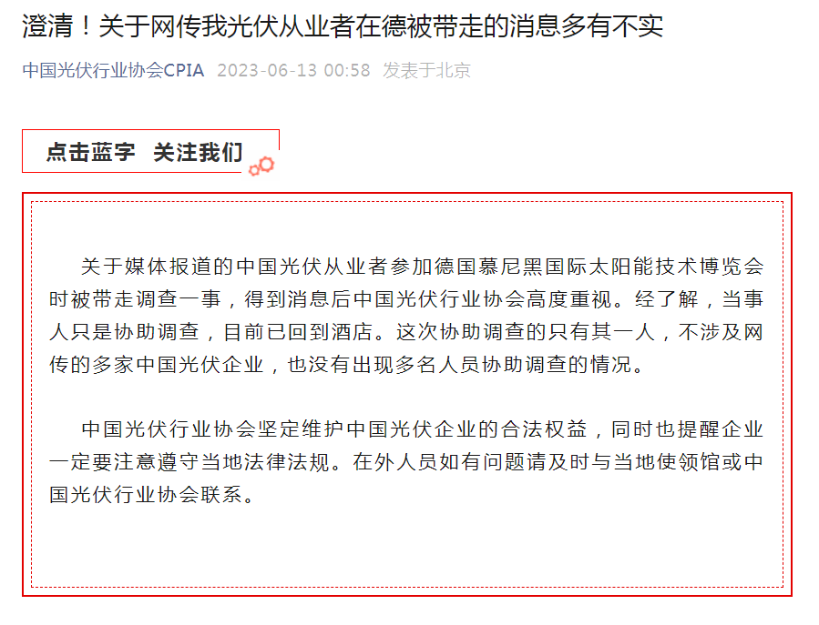據(jù)“中國光伏行業(yè)協(xié)會(huì)CPIA”微信公眾號(hào)13日消息,關(guān)于媒體報(bào)道的中國光伏從業(yè)者參加德國慕尼黑國際太陽能技術(shù)博覽會(huì)時(shí)被帶走調(diào)查一事,得到消息后中國光伏行業(yè)協(xié)會(huì)高度重視。經(jīng)了解,當(dāng)事人只是協(xié)助調(diào)查,目前已回到酒店。這次協(xié)助調(diào)查的只有其一人,不涉及網(wǎng)傳的多家中國光伏企業(yè),也沒有出現(xiàn)多名人員協(xié)助調(diào)查的情況。