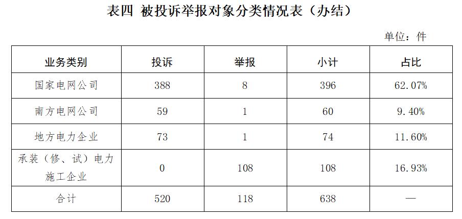 從被投訴舉報對象看,供電企業(yè)530件、占投訴舉報總數(shù)的83.07%,其中國家電網(wǎng)公司396件、占投訴舉報總數(shù)的62.07%,南方電網(wǎng)公司60件、占投訴舉報總數(shù)的9.40%,地方電力企業(yè)74件、占投訴舉報總數(shù)的11.60%;承裝(修、試)電力施工企業(yè)108件、占投訴舉報總數(shù)的16.93%。