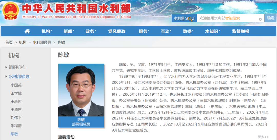 水利部網(wǎng)站“機構(gòu)”一欄更新后顯示,此前任應(yīng)急管理部防汛抗旱司司長的陳敏已任水利部黨組成員。