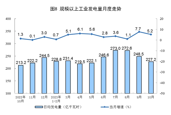 二、電力生產(chǎn)情況 電力生產(chǎn)穩(wěn)步增長。10月份,發(fā)電量7044億千瓦時,同比增長5.2%,增速比9月份放緩2.5個百分點,日均發(fā)電227.2億千瓦時。1—10月份,發(fā)電量73330億千瓦時,同比增長4.4%。